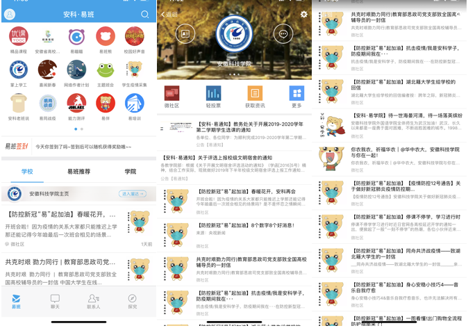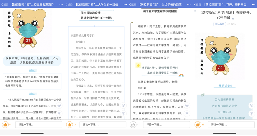 构建全方位的宣传体系,开设“防控新冠易起加油”版块,自1月25日起不间断推送各类疫情防控专题帖50余篇,介绍全国疫情防控形势,个人疫情防控知识,以及学校疫情防控工作部署安排,积极宣传抗疫一线的感人事迹。发起线上“我是安科学子—“易”起承诺”活动,承诺疫情期间科学防控,不传谣不信谣,学习预防并重,绝不提前返校。推送《爱体育手机官方网站_爱体育(中国)致全体师生员工一封信》《同舟共济战疫情——致湖北籍大学生的一封信》,有效凝聚起众志成城、共克时艰的强大正能量。