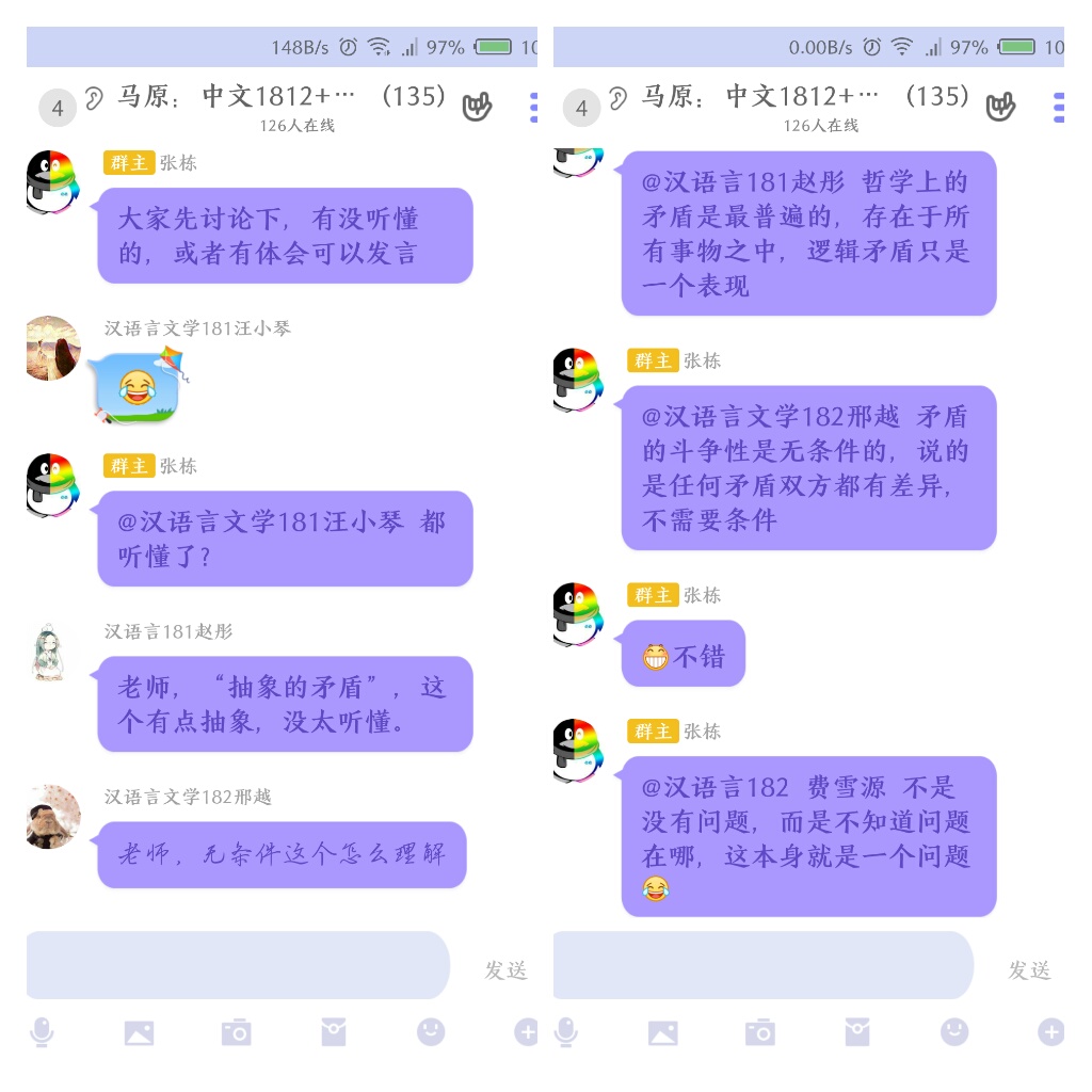 网课上,老师利用QQ电话认真讲解教学内容,在学习群里耐心回答同学们的问题。同学们十分活跃,信息一条条滚动,即使问题被“盖”到了上面,老师也还是会一条条浏览,逐一“@”回复。这样的讨论、提问即便是在课后也依然很频繁。赵彤说:“很喜欢这样的讨论,跟老师什么都能聊,很亲近。有一次上完课我们还在问老师问题,跟老师聊天,老师忽然回复说,不能聊了,我要吃饭了。惹得群里的同学都笑,那个时候都已经是下午一点多了。所以我们也能感受到老师们的辛苦,真的很感谢他们。”