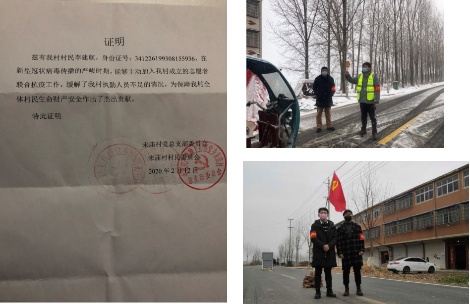 疫情形势严重期间,彭正没有任何胆怯,迎难而上。在值班安排时,他主动选择了环境最恶劣的夜班,风雪中从未迟到、缺席过一次。在得知村里防控物资短缺,他又第一个捐款1000元,并将自己的1100元助学金拿出来捐到村里。由于他的带头作用,村民们积极捐款,浮绥村后期捐款达到一万余元,极大缓解了村里防控物资的短缺问题。浮绥村的防控工作也被萧县党员先锋网点名表扬,彭正为自己的付出感到自豪,村民们也为村里有这样一位年轻的大学生小伙子感到骄傲,纷纷称赞道:“这个小伙子真不赖!”