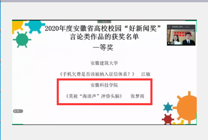 12月26日,以“‘后浪’奔涌,薪火承志”为主题的第十七届安徽省大学生记者峰会圆满落幕,本次会议采取腾讯会议线上举行,峰会对2020年度全省高校优秀新闻作品进行了表彰,我校新媒体中心再续辉煌,再次诞生全省“十佳校园记者”一名,言论类作品首次实现一等奖的突破。