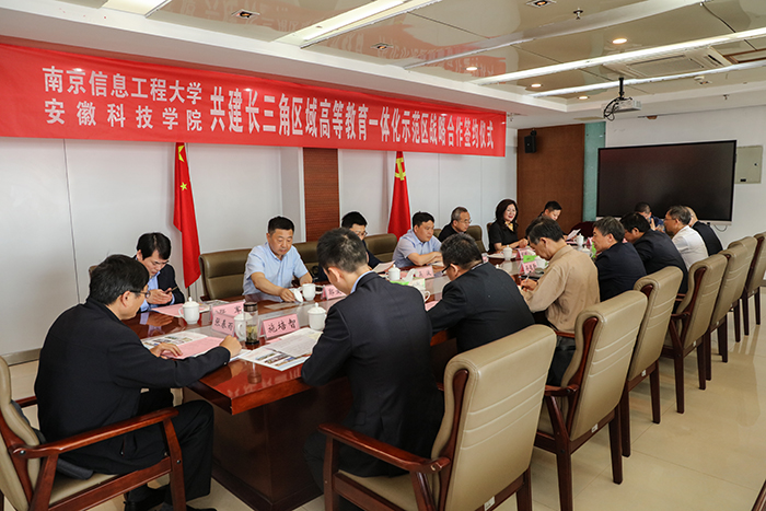 5月17日上午,我校与南京信息工程大学共建长三角区域高等教育一体化示范区战略合作协议签约仪式在凤阳校区图书馆十楼会议室隆重举行。南京信息工程大学党委副书记、校长李北群,党委常委、总会计师胡明保,我校党委书记蒋德勤,党委副书记、校长李震,党委委员、副校长李升和出席会议。南京信息工程大学和我校有关部门负责人参加了会议。会议由李震主持。