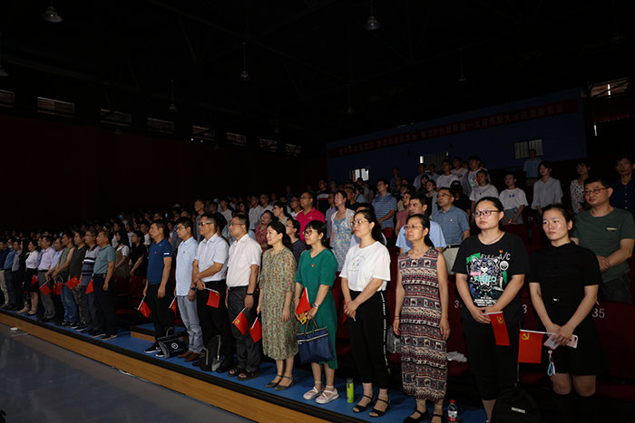 上午7:50,党委书记蒋德勤,党委副书记、校长李震,党委委员、副校长黄远友,党委委员、纪委书记、监察专员王强,党委委员、副校长李升和同机关工作人员、离退休老同志,凤阳校区各学院党政领导、师生代表齐聚在大学生活动中心,手握党旗、国旗,热切期盼大会的到来。龙湖校区各学院和驻龙湖校区职能部门工作人员也纷纷来到综合信息中心报告厅,收听收看大会盛况。