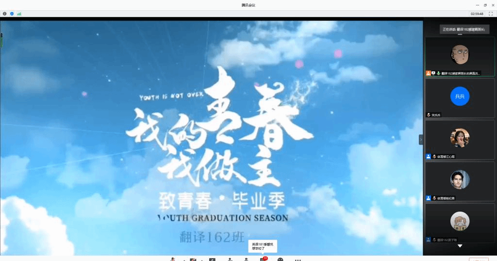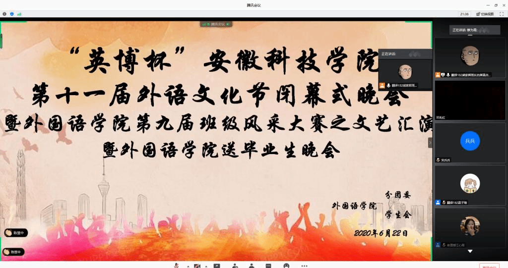 6月22日晚,外国语学院在腾讯会议上举行了“英博杯”爱体育手机官方网站_爱体育(中国)第十一届外语文化节闭幕式晚会暨第九届班级风采大赛文艺汇演暨送毕业生晚会。外国语学院院长陈德用、党总支书记蔡为青、副院长刘萍及师生代表参加。此外,班级风采大赛文艺汇演邀请动物科学学院学生会主席孙静、资源与环境学院学生会主席吴柳莹、人文学院学生会主席徐鹏飞,外国语学院六届二任学生会主席杨妍,英语162班班长张寻、外国语学院六届一任学生会文艺部部长宫思远、翻译161班团支书陈慧仁7名同学担任评委,晚会由英语182班刘珍珍和翻译182班胡玉辰2位同学主持。