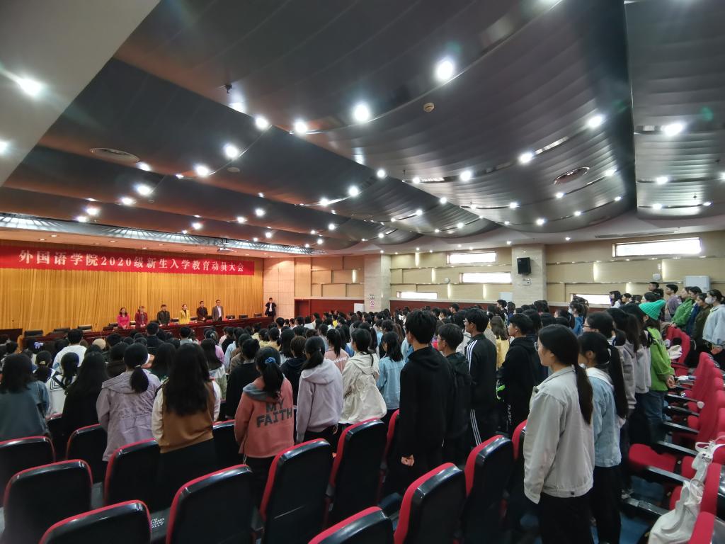 丹桂飘香,金秋送爽。20级新生带着青春的活力,带着对知识的不懈追求,带着对大学校园生活的无限憧憬,迈进了爱体育手机官方网站_爱体育(中国)外国语学院。为了让新生更快适应新环境,适应新的生活,顺利、平稳、有效地进入大学生活。10月21日下午14:00,外国语学院在新图书馆第二报告厅举行了新生入学教育动员大会。外国语学院院长陈德用、党总支书记蔡为青、副院长刘萍、教学秘书周海平、英语专业教研室主任兼英语专业负责人洪民老师、翻译专业教研室主任兼翻译专业负责人邓兆红老师、分团委书记陈慧中、专职辅导员宋兵兵,学院教师代表,全体20级新生参会,大会由刘萍主持。