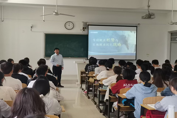 为深入学习贯彻习近平总书记对学校思政课建设作出最新重要指示精神,推进习近平新时代中国特色社会主义思想进课堂、进教材、进头脑。着力加快新时代学校思政课改革创新,切实提高思政课教育教学质量和育人效果,认真落实好校领导为本科生讲授思政课制度。5月16日-17日,校党委书记时伟教授到龙湖校区和凤阳校区分别为财经学院2023级会计学专业和生命与健康科学学院生物工程专业2022级讲授“当前就业形势与实施就业优先战略”专题形势与政策课。