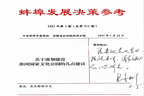近日,由我校马克思主义学院教师邵蓉蓉撰写的《关于谋划建设淮河国家文化公园的几点建议》咨政报告,获蚌埠市政府副市长吴永彬肯定性批示。