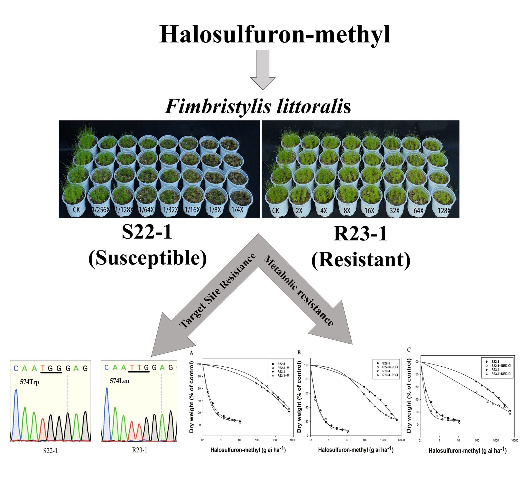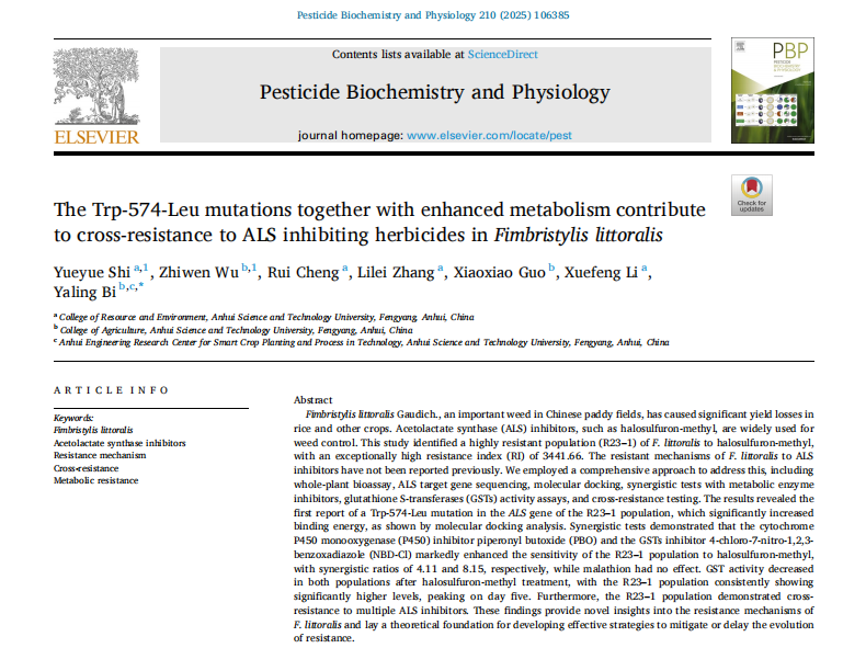 近日,我校农学院毕亚玲教授团队在国际知名期刊《Pesticide Biochemistry and Physiology》(中科院一区Top期刊,IF=4.2)发表了题为“The Trp-574-Leu mutations together with enhanced metabolism contribute to cross-resistance to ALS inhibiting herbicides inFimbristylis littoralis”的研究论文。该研究首次揭示了稻田恶性杂草水虱草(Fimbristylis littoralis Gaudich.)对乙酰乳酸合成酶(ALS)抑制剂类除草剂的抗性机制。硕士研究生史悦悦和青年教师吴志文博士为共同第一作者,毕亚玲教授为通讯作者,爱体育手机官方网站_爱体育(中国)为唯一完成单位。