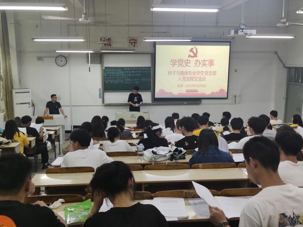 5月24日下午,农学院种子与植保专业学生党支部在求知楼A105开展微党课活动,支部第56期全体入党积极分子参会,活动由支部党员张英健主持,微党课由支部书记汪道兵担任主讲。