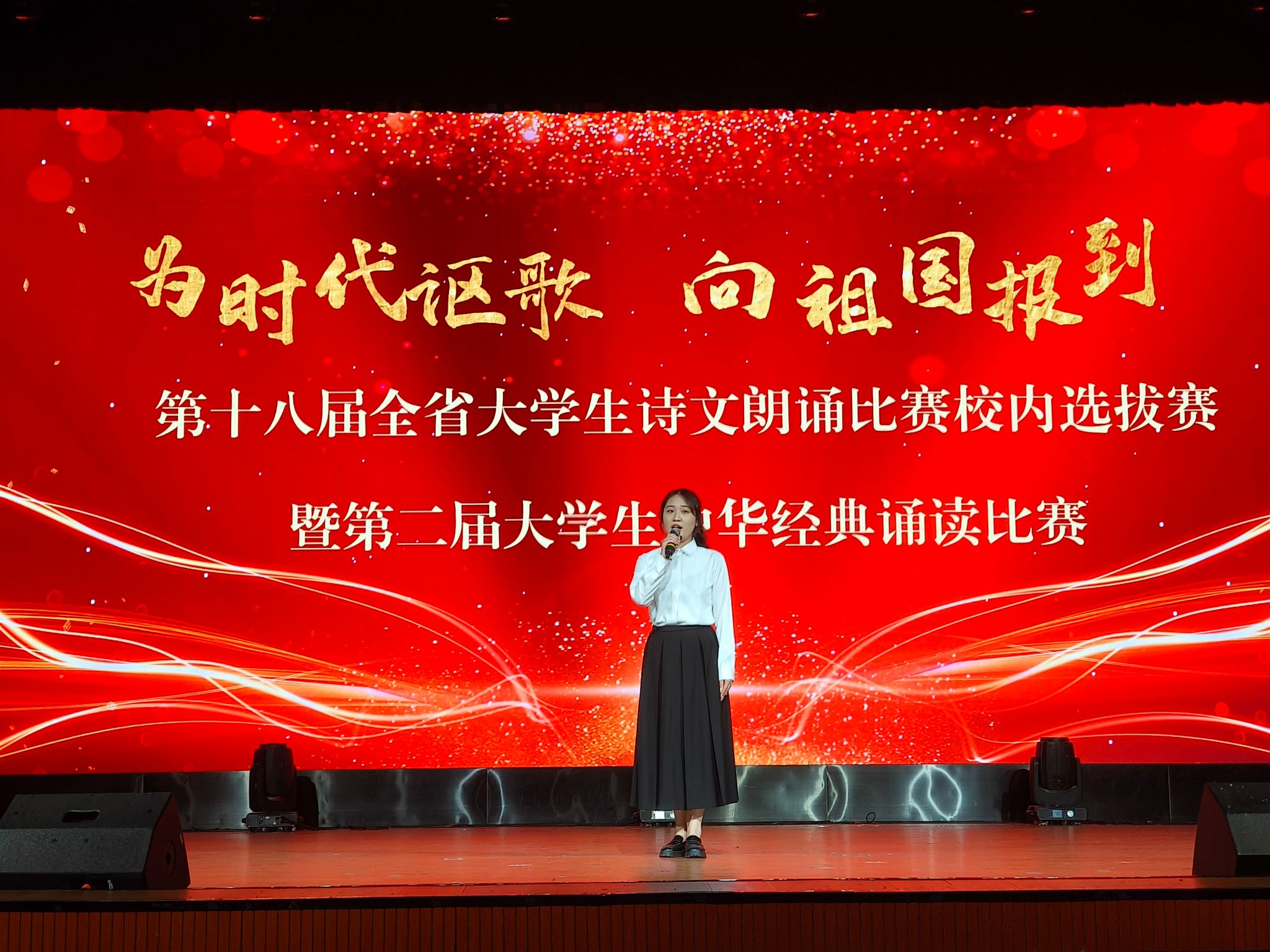 经各二级学院的选拔与推送,本次比赛共有十四组作品参赛。比赛现场,选手们以经典诗文作品进行朗诵再创作,通过刚劲有力的诵读、抑扬顿挫的声调、满怀激情的演绎,将字里行间的情感抒发得淋漓尽致,用声音传递中华文化的魅力,歌颂祖国的崭新篇章。