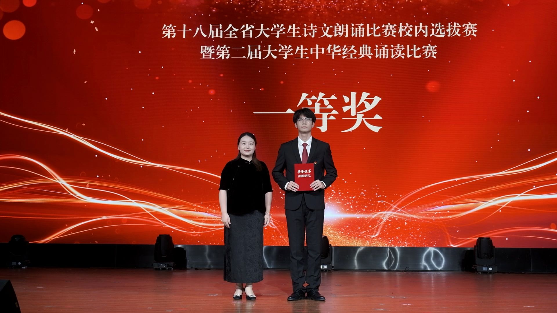 经过精彩的比拼角逐,《时间的入口》(朗诵者:王洋旭)斩获一等奖,《不朽》(朗诵者:李文文)、《我们的青春》(朗诵者:袁雪、唐静静)获得二等奖,《青春中国》(朗诵者:王浩)、《秋天里的中国》(朗诵者:黄勇诚)、《这是一张张怎样的脸》(朗诵者:张馨予)、《诗颂风华》(朗诵者:李子燕、鄢德强、郭甜)获得三等奖。