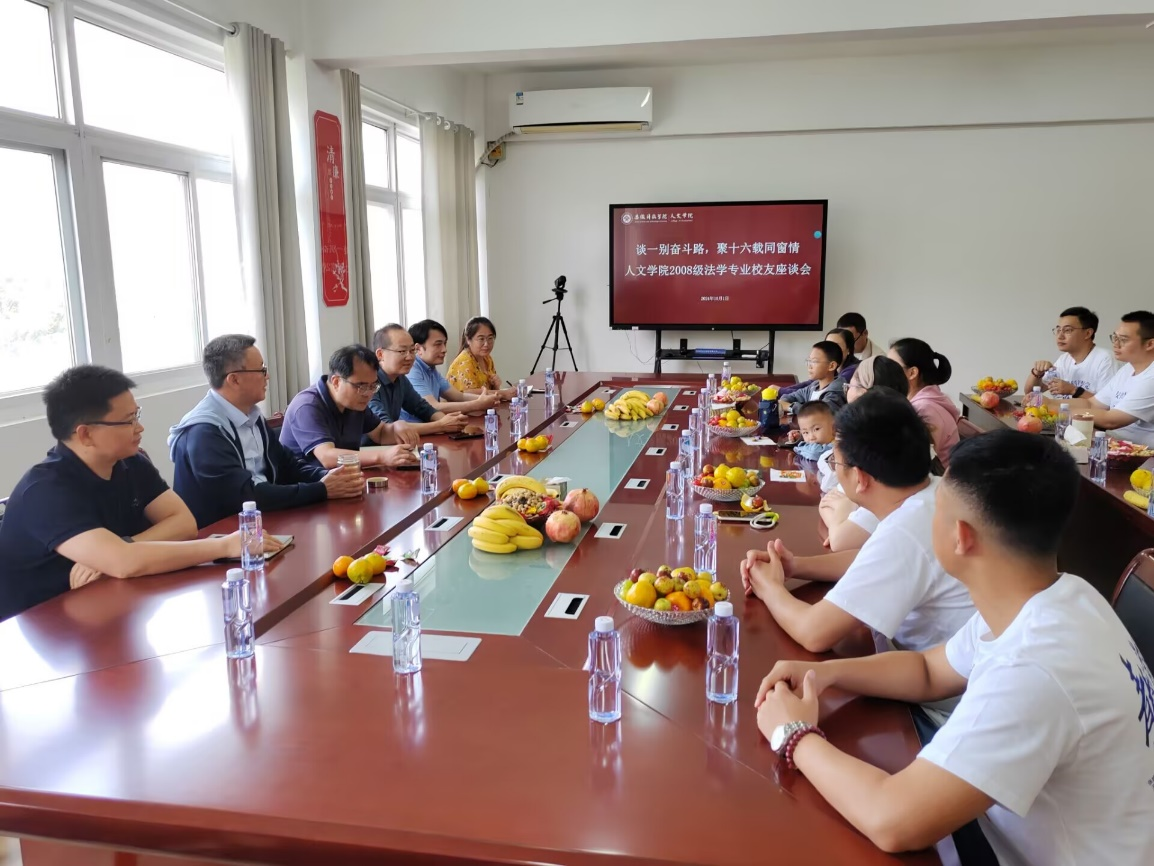 2024年10月1日,丹桂飘香,举国欢庆,人文学院2008级法学专业的31位校友,身着“青春不散场”的统一服装,怀着对母校的深深眷恋和对青春岁月的美好回忆重返校园,在学知楼324会议室参加学院举办的温馨而富有意义的校友座谈会,学院党政领导、2008级法学专业两位班主任老师骆绪刚、宣刚及学院就业工作联系人焦雪松等出席。