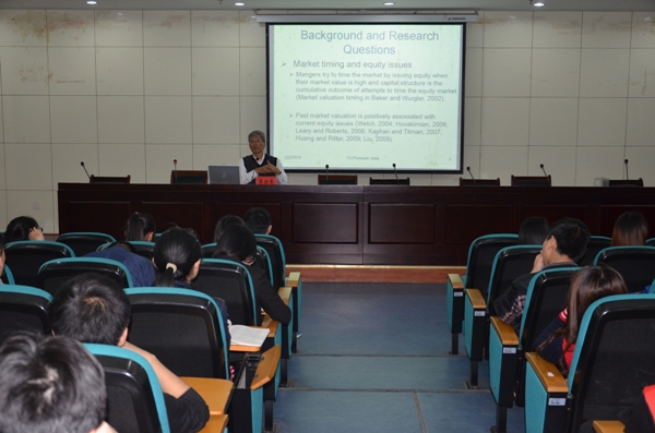 报告会的主题为有关公司的融资决策。已有文献证实,新股发行多基于对现有股价的判断。然而,蒋晓泉教授及其合作者认为,在非对称信息条件下,新股发行更有可能基于对未来股价的预期。在构建一个简明的理论模型的基础上,蒋晓泉教授及其合作者使用美国资本市场数据进行实证研究发现,对现有股价和未来股价的判断都对公司的融资决策产生影响,但是,对未来股价的判断更强且更为持续地影响了企业的融资决策。考虑到大公司在融资决策时信息不对称的可能性较低,本项研究进一步分大小公司样本作了细致的稳健性检验。在小公司样本中,仍然存在显著的预期股价对公司融资决策的影响。