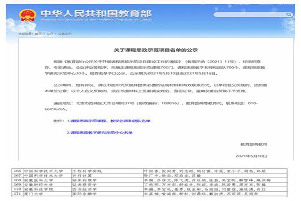 近日,教育部网站公布了《关于课程思政示范项目名单的公示》,我院《西方经济学》课程获批教育部普通本科教育课程思政示范课程,学院副院长、国际经济与贸易系党支部教师李强、李宝礼等获批课程思政教学名师和团队称号。2021年度,安徽省属本科高校仅三门课程获批该示范项目。