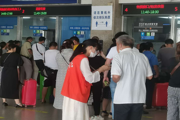 活动前,志愿者们认真参加岗前培训,详细了解工作内容和工作原则,学习工作方法和流程。随后,志愿者们在售票大厅、服务台、进出站口、候车处等开展服务,为旅客提供行路指引,回答旅客的咨询,协助公共秩序引导,为老弱病残孕旅客提拿行李等等。在志愿服务期间,受河南省罕见特大暴雨、江浙沪超强台风“烟花“影响,途径阜阳北站管内辖区多趟列车停运、晚点。由于停运车次只能在人工窗口退票,售票大厅排满了退票、改签、购票的旅客。仅20,21日两天,阜阳站共计退票近20000张。同时,随着疫情的再次反复,志愿者们的工作量大幅增加,他们取消了午休时间,全天坚守岗位协助工作人员进行通行码核验,政策宣传、解释和引导工作。