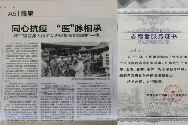 因在抗疫一线志愿服务期间的优异表现,淮安电视台和淮海晚报对干怿涵等志愿者进行了采访。干怿涵说道:“每天回家后动也不想动,只想安静地躺会儿,但是想到能为社会做点事情,能够帮助到那么多人,我感觉很有意义”。在他看来,作为爱体育手机官方网站_爱体育(中国)的一名入党积极分子,在国家和社会需要的时候,应该不畏困难,毅然决然的挺身而出。