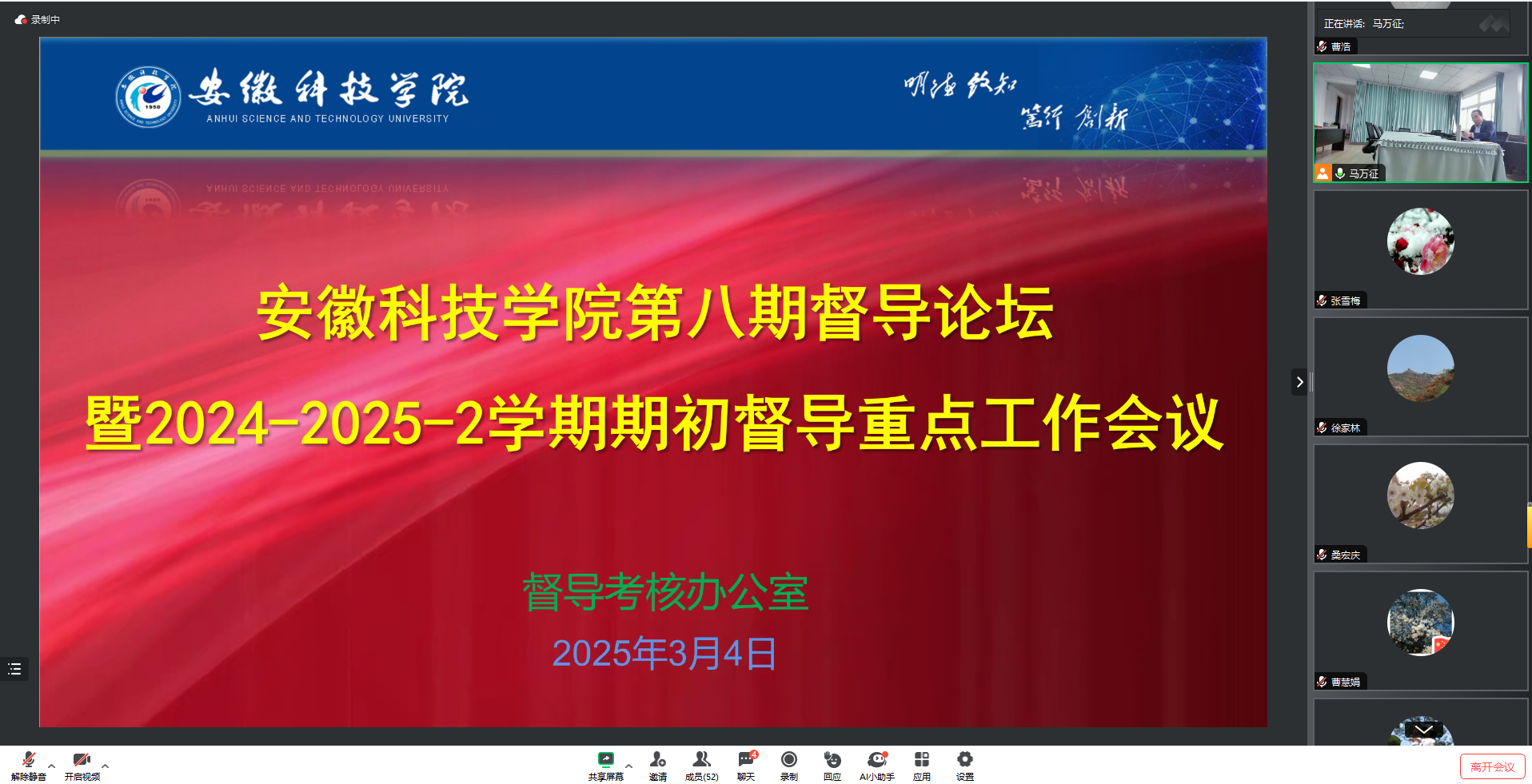 3月4日下午,学校召开第八期督导论坛暨新学期期初教学督导重点工作会议。全体校教学督导员、院督导员、督导考核办公室工作人员参加了会议,会议由教学督导科科长马万征主持。