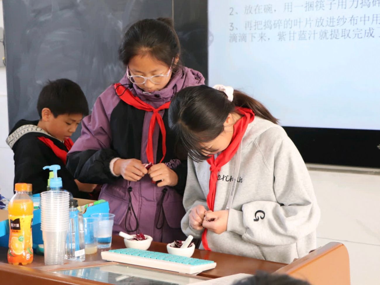 在活动中,支教小分队的志愿者们精心准备了一场别开生面的科学课程,通过实践探索紫甘蓝溶液与不同液体混合后的色彩变化,带领学生们走进科学的奇妙世界。