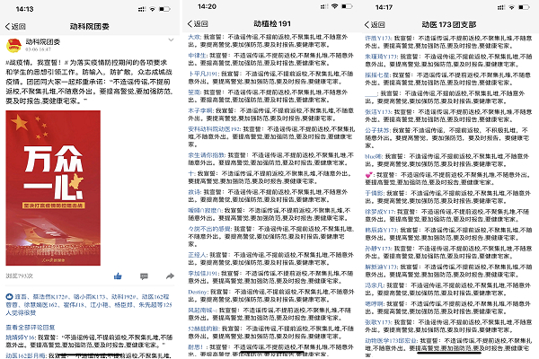 本次线上承诺接力活动是由动物科学学院团委主办,依托“动科团委”QQ发表说说,要求各团支部进行转发。动物科学学院团学干部带头在线上进行承诺,并对支部同学进行督促,实现了全覆盖,无遗漏,确保每位同学做出承诺,人人防控到位。一条条承诺接力彰显了动物科学学院广大团员青年严格遵守学校的各项防疫要求的态度和决心。