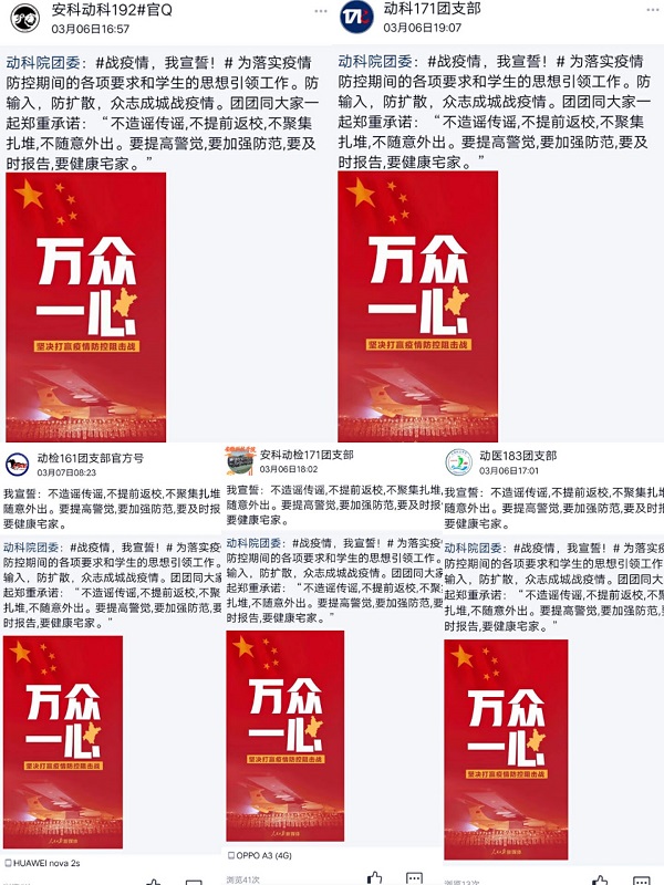 我宣誓“不造谣传谣,不提前返校,不聚集扎堆,不随意外出。要提高警觉,要加强防范,要及时报告,要健康宅家”。在疫情防控工作到了最吃劲的关键阶段,动物科学学院广大团员青年的思想上和行动上始终没有丝毫放松,全院一千余名学生共同线上签订“防疫承诺”,筑起严密牢固的防疫战线。