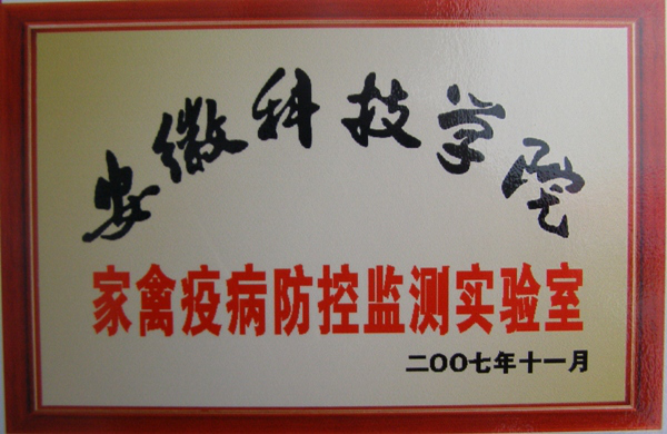 “家禽疫病防控监测安徽省重点实验室”由安徽省教育厅于2007年8月批准立项建设,现有专业技术人员26人,其中教授7人,副教授7人,高级实验师1人,讲师及相应职称8人,助理实验师2人;具有博士学位9人,在读博士3人,硕士学位6人。重点实验室总面积约1300平方米,其核心区域按生物安全二级实验室的建设标准进行规划与设计,包含“临床样品病原分离与检测区”、“标准分子生物学(PCR)实验区”、“细胞生物学实验区”、“综合实验室”、“蛋白质分析检测室”和“SPF级实验动物中心”。