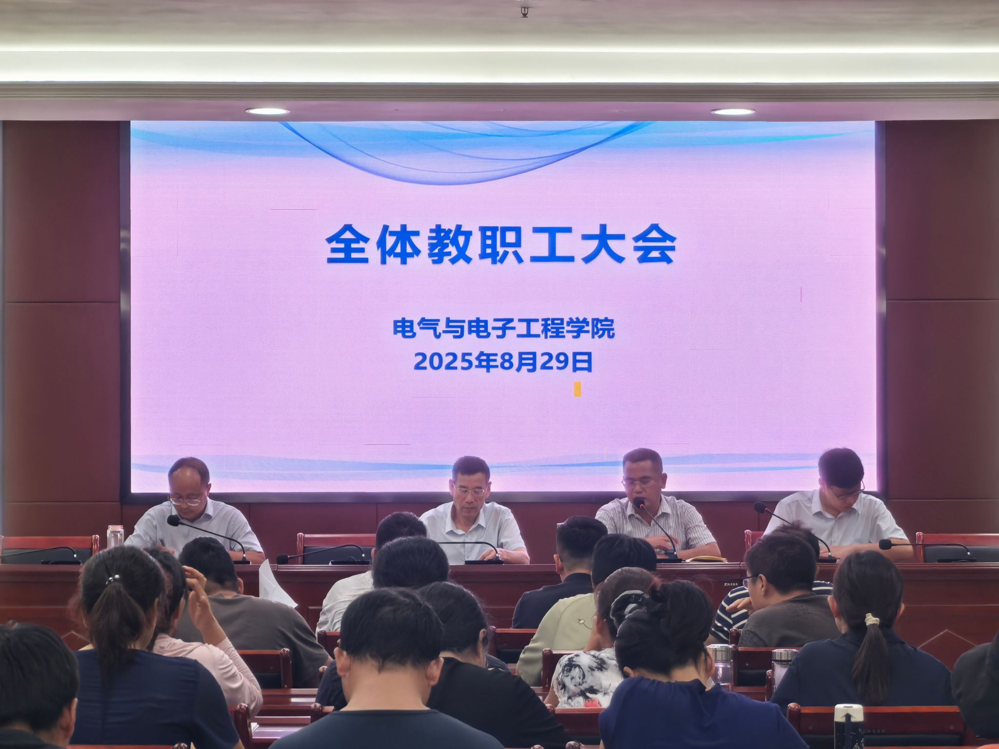 8月29日下午,电气与电子工程学院于西辅楼111会议室召开全体教职工大会。学院党委书记骆海邦,党委副书记、院长夏显明,党委副书记尚磊,副院长樊晓宇及全体教职工参加了会议,会议由骆海邦主持。