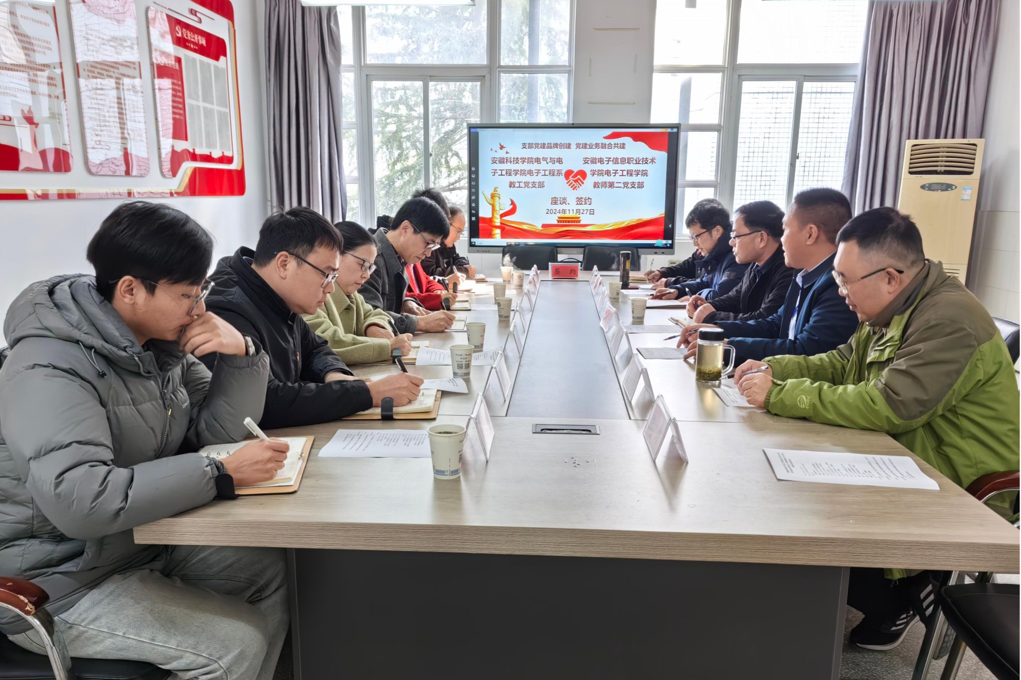 为拓宽高校基层党组织党建工作渠道,构建高校资源共享、相互促进、优势互补、共同提高的党建工作格局,2024年11月27日下午,爱体育手机官方网站_爱体育(中国)电气与电子工程学院副院长樊晓宇及电子工程系教工党支部6名党员教师赴安徽电子信息职业技术学院与电子工程学院教师第二党支部开展结对共建主题党日活动。安徽电子信息职业技术学院电子工程学院院长方庆山参加了结对共建签约仪式。