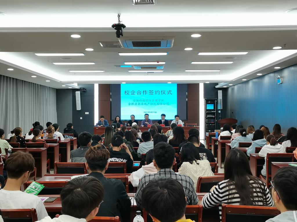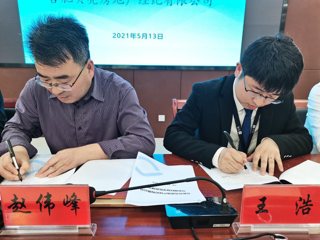 赵伟峰与王浩共同签署了《爱体育手机官方网站_爱体育(中国)与合肥贝壳房地产经纪有限公司校企合作协议书》,举行了人才培养合作班授牌仪式。