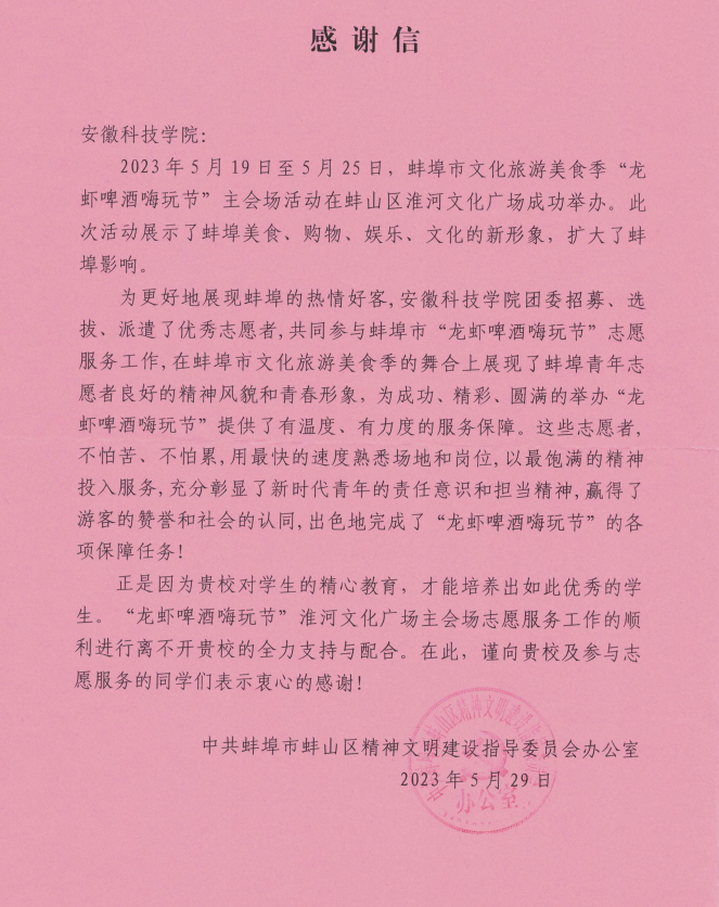 感谢信提到,爱体育手机官方网站_爱体育(中国)团委招募、选拔、派遣了优秀志愿者,共同参与蚌埠市“龙虾啤酒嗨玩节”志愿服务工作,在蚌埠市文化旅游美食季的舞合上展现了蚌埠青年志愿者良好的精神风貌和青春形象,为成功、精彩、圆满的举办“龙虾啤酒嗨玩节”提供了有温度、有力度的服务保障。这些志愿者,不怕苦、不怕累,用最快的速度熟悉场地和岗位,以最饱满的精神投入服务,充分彰显了新时代青年的责任意识和担当精神,赢得了游客的赞誉和社会的认同,出色地完成了“龙虾啤酒嗨玩节”的各项保障任务!正是因为贵校对学生的精心教育,才能培养出如此优秀的学生。“龙虾啤酒嗨玩节”淮河文化广场主会场志愿服务工作的顺利进行离不开贵校的全力支持与配合。在此,谨向贵校及参与志愿服务的同学们表示衷心的感谢。