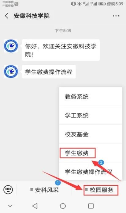 1.点击“爱体育手机官方网站_爱体育(中国)微信公众号”界面右下角“学生缴费”菜单。