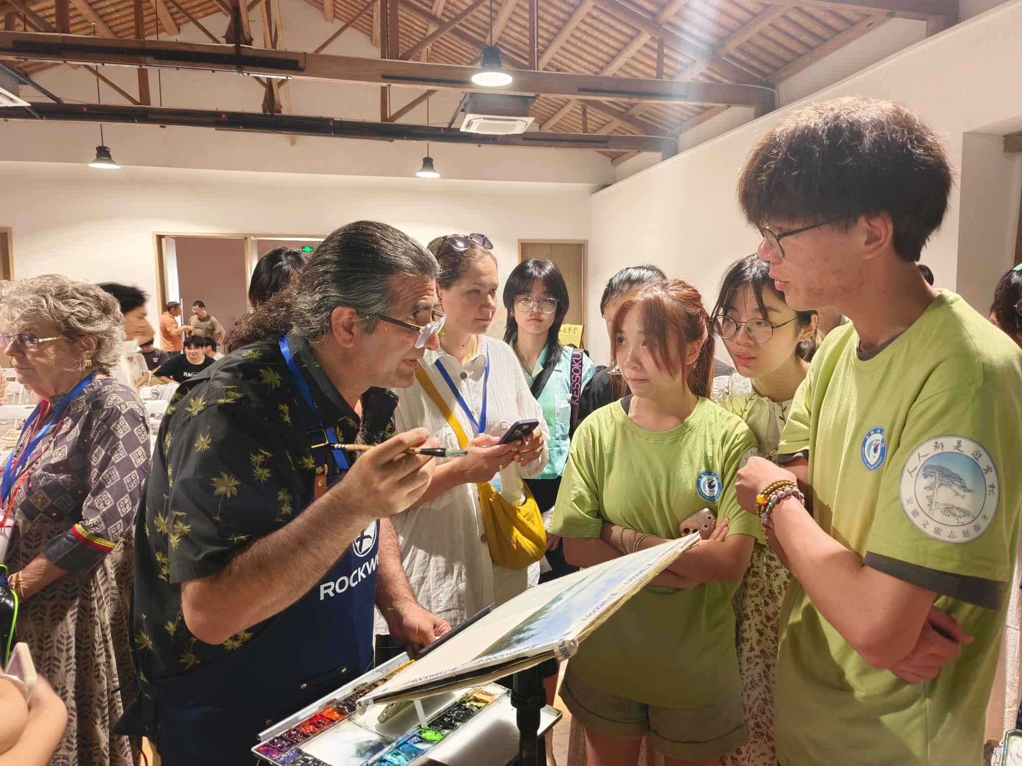 在西递黟山大学堂的教室里,团队成员与艺术家们亲切交流,表达对画作的喜爱之情,并与艺术家合影留念。在接下来的活动中,艺术家们纷纷挥毫泼墨,将所见所闻、所感所想倾注于画布之上,创作出一幅幅充满生活气息与艺术韵味的佳作。这些作品不仅展现了他们独特的个人风格和艺术魅力,更体现了他们对生活的热爱和对艺术的执着追求。