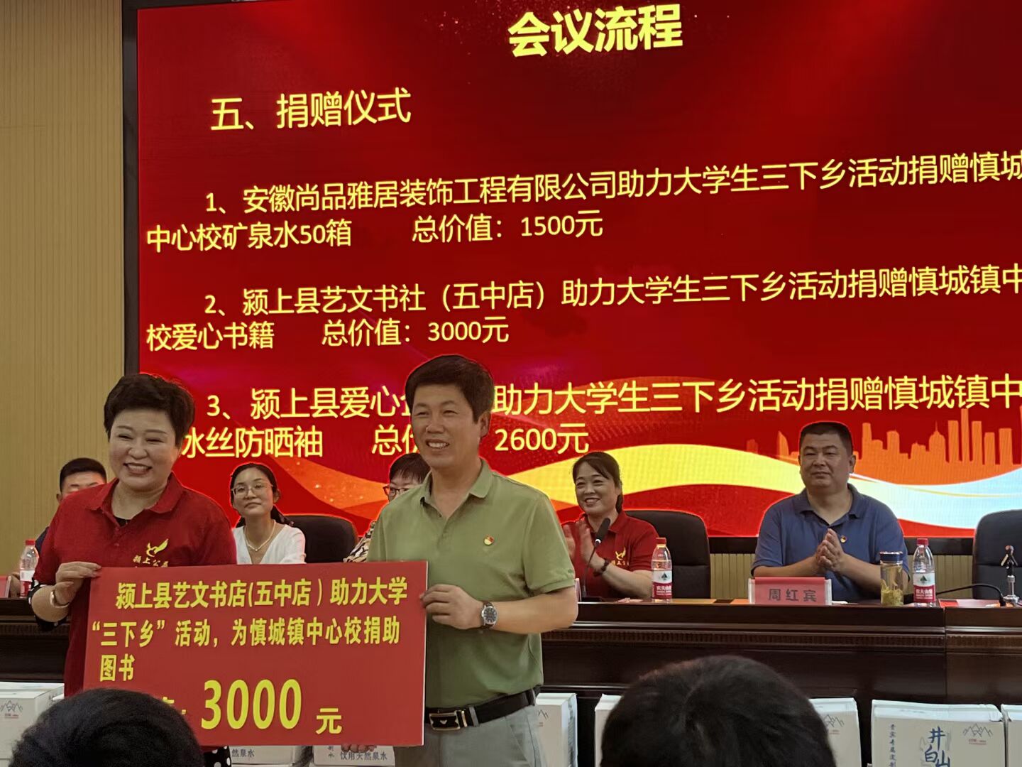 仪式上,建筑学院学生代表、“星星梦之队”实践团队长王健伟发言;当地企业和个人为助力大学生“三下乡”活动,向慎城镇中心学校捐赠了图书、防晒袖套和矿泉水等。