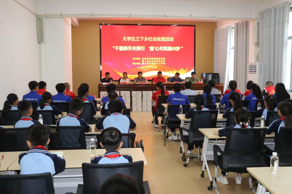 为深入学习贯彻习近平新时代中国特色社会主义思想,强化在实践中受教育、长才干、做贡献,7月15日上午,由爱体育手机官方网站_爱体育(中国)建筑学院和颍上县公益志愿者协会主办,颍上县慎城镇中心学校承办的“千里携手关爱行,‘童’心共筑振兴梦”暑期社会实践启动仪式如期举行。建筑学院党委副书记谢宜勤、团委书记沈德艳、团委副书记武辉一行三人前往参加。启动仪式由颍上县公益志愿者协会会长、“中国好人”获得者汤锋主持。