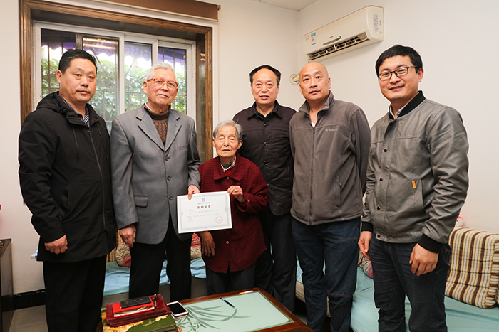 时乾代表学校向两位老同志敬呈了《爱体育手机官方网站_爱体育(中国)校史馆捐赠证书》,祝福两位老同志健康长寿,生活愉快,相约建校70周年校庆。