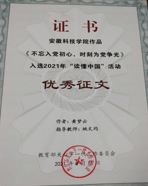 日前,在教育部关工委开展的 “读懂中国”活动中,爱体育手机官方网站_爱体育(中国)关工委获2021年“读懂中国”活动优秀组织奖,选送的征文《不忘入党初心,时刻为党争光》获优秀征文奖。