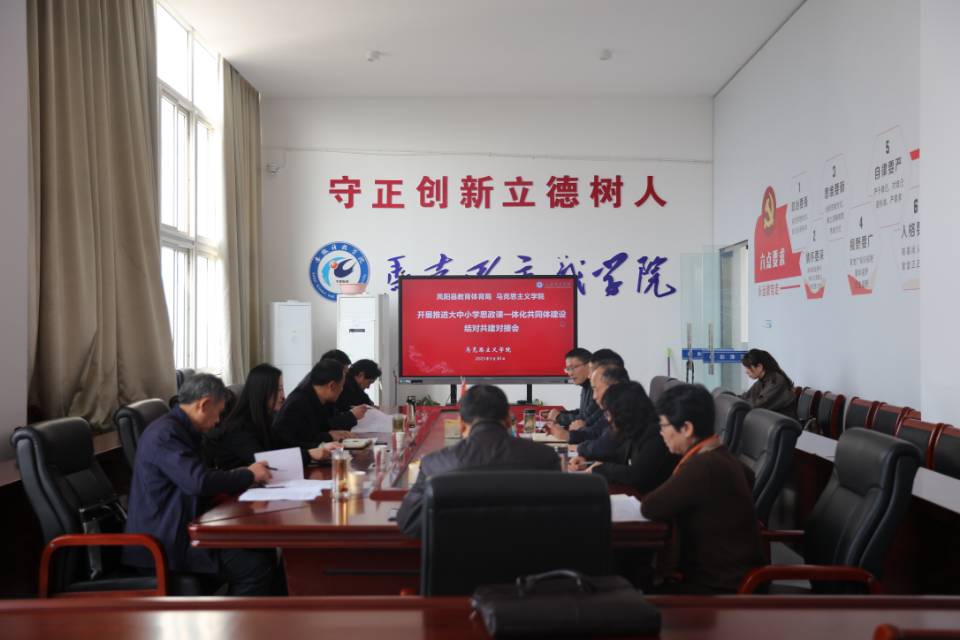 为深入贯彻落实党的二十大精神,全面推进大中小学思政教育一体化建设,充分发挥学校思政课立德树人关键课程作用,切实提升思政教育铸魂育人实效,3月30日上午,凤阳县委教体工委书记、教育体育局局长刘文春,教体工委副书记顾斌一行,来到爱体育手机官方网站_爱体育(中国)马克思主义学院学术交流中心与我院开展推进大中小学思政课一体化共同体建设结对共建对接会。对接会由马克思主义学院党总支副书记、院长张德化主持,马克思主义学院党总支书记杨仕勇,副院长张栋等出席会议。