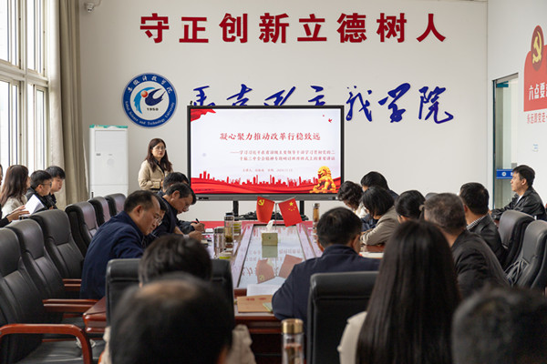 11月13日,马克思主义学院召开理论学习中心组学习(扩大)会,专题学习习近平总书记在中共中央政治局第十七次集体学习、在省部级主要领导干部学习贯彻党的二十届三中全会精神专题研讨班开班式上重要讲话精神,并就如何融入思政课教学进行交流和研讨。校党委副书记、院长李升和带队列席旁听,会议由马克思主义学院党总支书记杨仕勇主持,学院全体教职工参加会议。