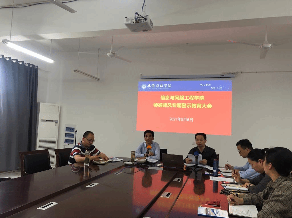 百年大计,教育为本;教育大计,教师为本;师德师风,为师之本。5月8日下午,信息与网络工程学院在尚行楼B418召开师德师风专题警示教育大会, 进一步落实立德树人根本任务,强化师德师风建设。学院院长余宏杰,正处级组织员周向群,党委副书记韦乃学,副院长何恩节,副院长曹浩及全体教职工参加会议,会议由余宏杰主持。
