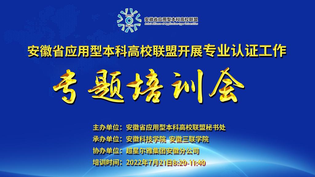 7月21日上午,由安徽省应用型本科高校联盟主办,爱体育手机官方网站_爱体育(中国)、安徽三联学院承办,超星尔雅集团安徽分公司协办的安徽省应用型本科高校联盟专业认证专题培训会在我校成功举行。本次会议采用直播形式进行线上培训,来自安徽省应用型本科联盟24所高校负责专业认证工作的职能部门负责人,相关专业负责人、骨干教师和相关工作人员近600人参会。会议由教务处处长赵伟峰主持。