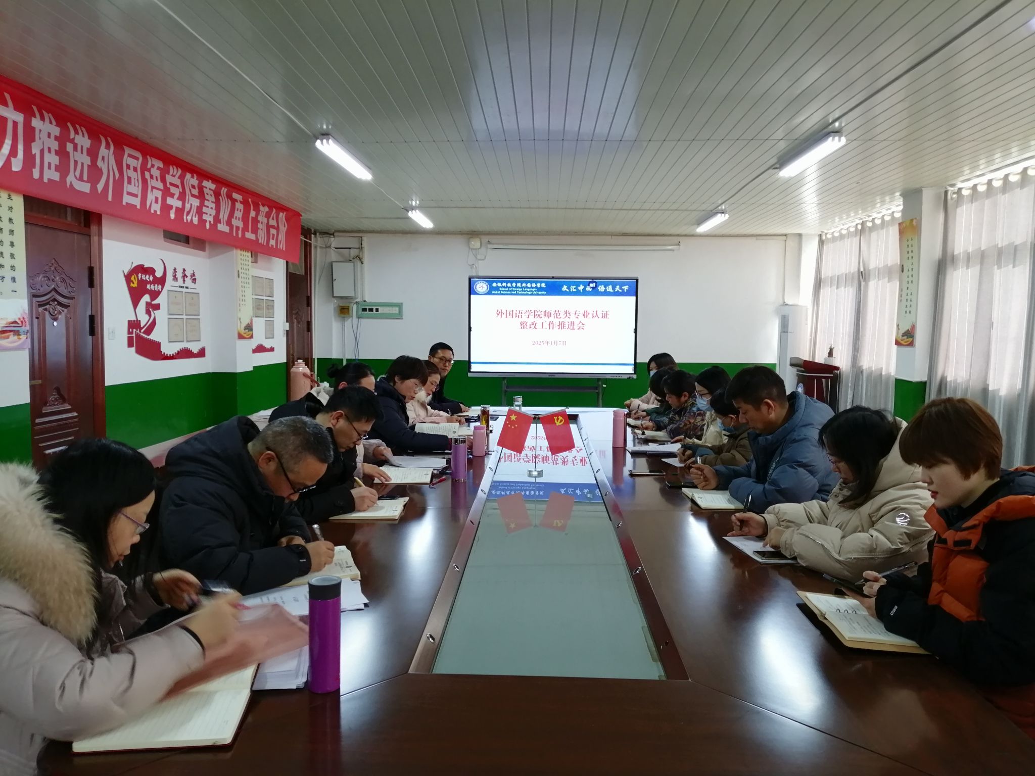 1月7日下午,外国语学院在学院会议室召开专业认证整改工作推进会。会议由外国语学院院长刘萍主持,学院党政领导和英语专业教研室全体教师参加会议。
