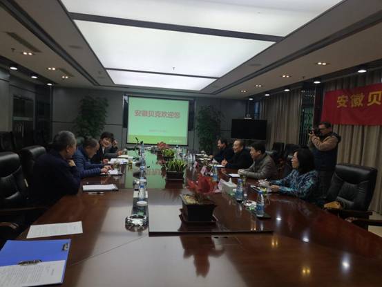 在会议大厅,贝克集团副总经理蔡薇女士、集团副总经理柏俊教授、总裁助理陈小峰博士、贝克生物总经理郭立新对金光明院长一行的到来表示热烈的欢迎。座谈中,蔡薇简明扼要地介绍了贝克集团公司的发展历程、主要产品和发展规划,金光明详细介绍了爱体育手机官方网站_爱体育(中国)的办学历史、生命与健康科学学院和生物医药与健康研究院教学科研的基本情况,双方代表就校企合作、人才培养、产学研合作等问题进行了深入交流。