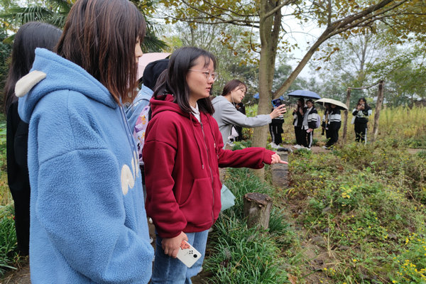 在参观过程中,马鑫莹向2021级新生介绍了各类中草药以及药园的种植情况,讲述一些中草药的生长习性、成熟期和药效等特点。形态各异的中草药让新生们频频驻足,同学们对每一株植物都充满新奇,用手触碰植物,感受生命的美好。在中药科技园里,同学们看见了很多在日常生活中见不到的植物,而近距离接触这些中草药更是让同学们从各个方面感受其独特之处,体会其神秘之处。