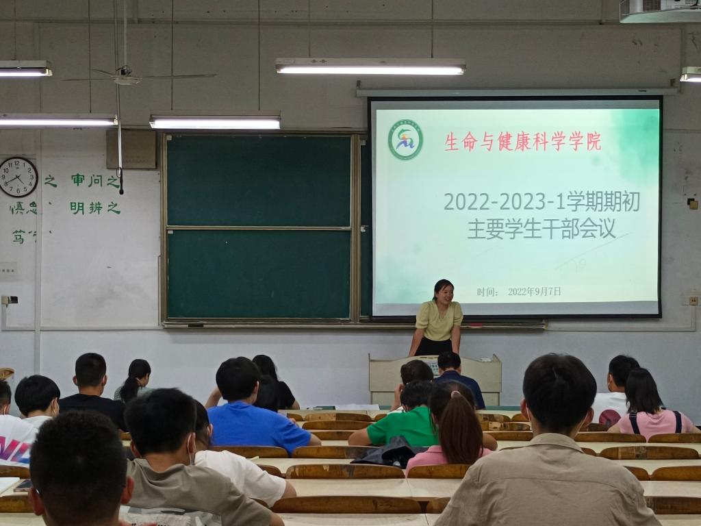 9月7日下午,生命与健康科学学院于求知楼A101教室召开学期初主要学生干部会议,学院党委副书记彭丽萍、全体专职辅导员、各班级及学生组织主要学生干部代表参加会议。会议由副科级辅导员刘国祥主持。