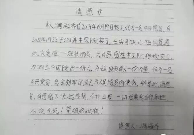 2019年6月,她成为一名正式党员;今年1月3日,她在泗县中医院中药房实习;1月30日,她主动请缨奔赴了救死扶伤的一线战场。在请愿书中她这么说:“祖国遭遇新型冠状病毒危难,我自愿留下抗战疫情,不计回报,自行承担后果,不论生死!”这个假期,很多人守在家中躲避疫情,满海乔每天看着新闻中持续上升的数字,看到无数人义无反顾地冲在防疫第一线,同时,关注着学校党委下发的要求各级党组织和广大党员要做抗击疫情的中流砥柱的通知,她坚定地选择成为这场战役的“逆行者”。