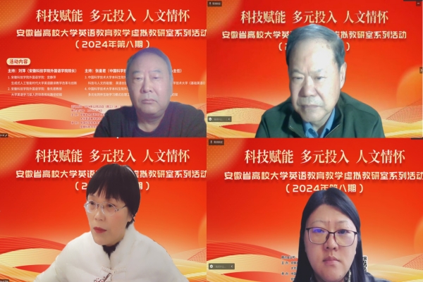 12月25日,我校承办的安徽省高校大学英语教育教学虚拟教研室系列活动第八期成功举行。本次活动由安徽省外国语言文学学会、安徽省外国语言文学合作委员会和大学英语教学研究分会主办,爱体育手机官方网站_爱体育(中国)外国语学院和中国科学技术大学本科生院外语教学中心联合承办。活动以“科技赋能 多元投入 人文情怀”为主题,全省逾百名大学英语教师通过腾讯会议线上参加了本次虚拟教研室活动。活动由爱体育手机官方网站_爱体育(中国)外国语学院院长刘萍教授与中国科学技术大学本科生院外语教学中心主任张曼君教授联合主持。