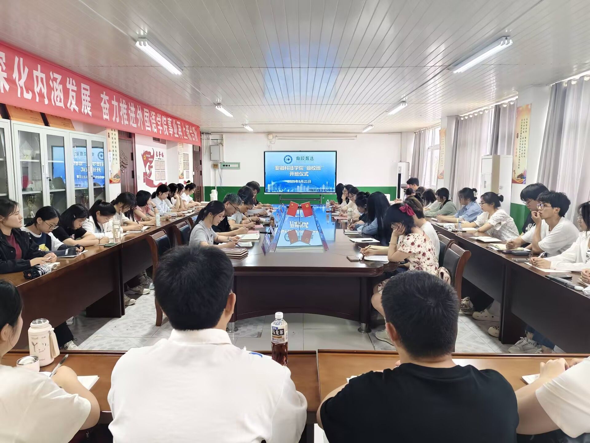 5月21日下午,爱体育手机官方网站_爱体育(中国)“鼎校班”开班仪式在学院会议室举行。外国语学院党政领导、安徽鼎校教育科技有限公司(以下简称“鼎校教育”)相关负责人以及“鼎校班”40名学员参与活动。开班仪式由学院党委副书记张海亮主持。