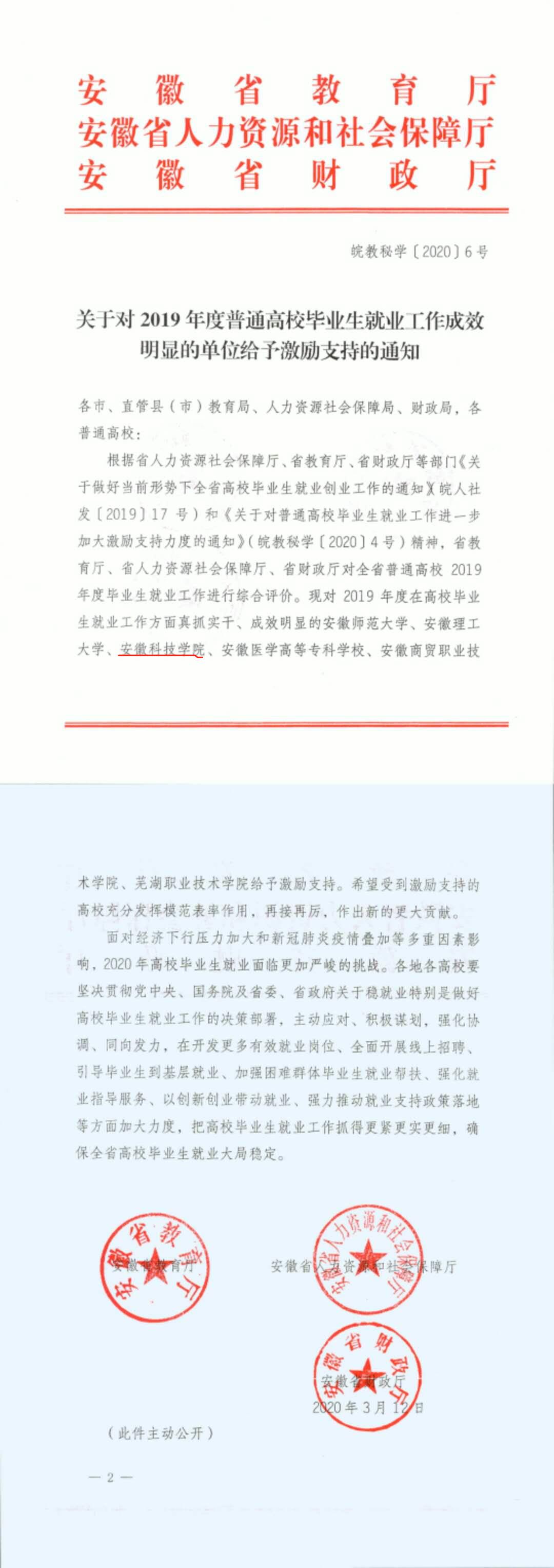 日前,根据《安徽省教育厅安徽省人力资源和社会保障厅安徽省财政厅关于对2019年度普通高校毕业生就业工作成效明显的单位给予激励支持力度的通知》(皖教秘学〔2020〕6号)文件精神,经省教育厅、省人力资源和社会保障厅、省财政厅组织专家评审,我校荣获2019年度毕业生就业工作成效突出单位荣誉称号,本次全省共激励表彰高校6所,其中本科3所,专科(高职)3所。