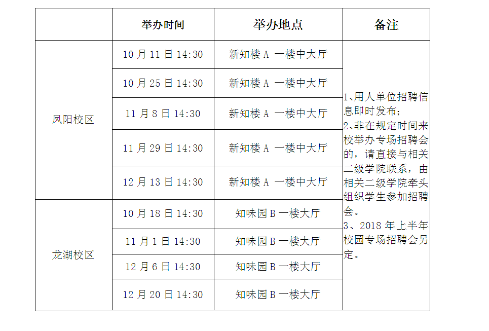 我校定于2017年11月18日举办2018届毕业生农科类大型就业洽谈会(凤阳校区),11月19日举办2018届毕业生秋季大型就业洽谈会(龙湖校区),2018年5月上旬举办2018届毕业生春季大型就业洽谈会,具体时间、报名方式等以学校十月中下旬左右发布的就业洽谈会邀请函为主。