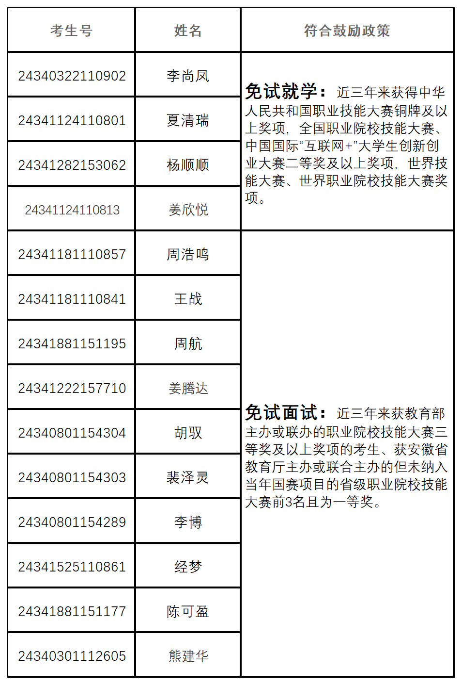 根据《爱体育手机官方网站_爱体育(中国)2024年面向中职毕业生对口招生章程》关于申请免试就学、免试面试和加分鼓励政策的相关要求,经考生申请,学校审核,共有李尚凤等4名考生符合免试就学政策,周浩鸣等10名考生符合技能大赛免试面试政策,无符合考试加分政策考生,现对符合相关鼓励政策的考生信息予以公布。免试就学资格复审和免试面试具体安排见通知公告栏“爱体育手机官方网站_爱体育(中国)2024年对口招生考试免试就学资格复审和免试面试工作通知”。如有异议或遗漏,请于4月3日17:00前联系爱体育手机官方网站_爱体育(中国)招生办公室:0550-6732041,0552-3197041。