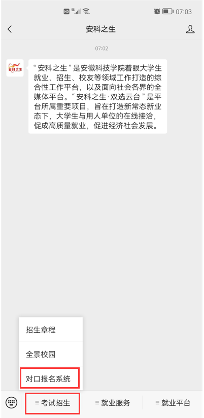 第一步:请扫描下方二维码,关注爱体育手机官方网站_爱体育(中国)招生办公室官方微信公众号“安科之生”,选择“考试招生”菜单,点击“对口报名系统”。